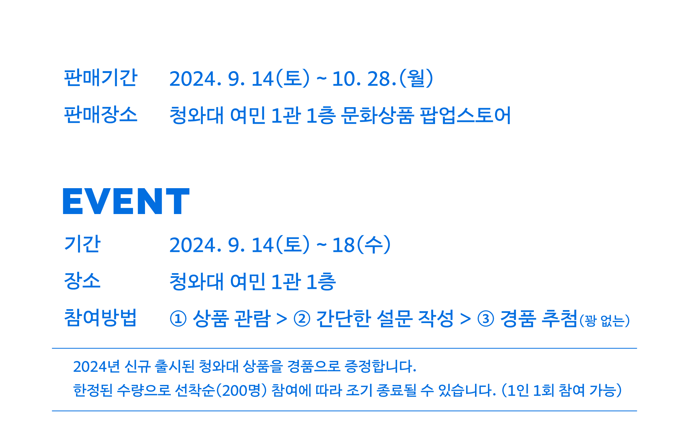 2024년 청와대 문화상품 출시(9.14~) 조회수 11,129 재단법인 청와대재단에서 청와대 개방 이후 처음 출시하는 2024년 청와대 문화상품을 소개 합니다. 출시된 상품들은 10월 28일까지 청와대에 방문하시면 구입도 가능합니다. 현장에서 간단한 설문에 참여해주시는 분들에게 랜덤으로 굿즈를 증정하는 이벤트도 진행될 예정입니다. 많은 관심과 참여 부탁 드립니다! - 판매기간 : 9.14(토) ~ 10.28(월), 09:00~18:00 *야간개방 기간(9.14~9.18) 연장 운영(19:30~21:30) - 판매장소 : 청와대 여민1관 1층 휴게공간 [이벤트] - 기간 : 9.14(토) ~ 9.18.(수) - 참여방법 : (현장참여) 굿즈 관람 > 간단 설문지 작성 > 경품 추첨 > 경품 수령! *1인 1회 참여 가능 *선착순(200명) 참여에 따라 조기 종료될 수 있습니다. 첨부파일 png 아이콘 청와대 문화상품 출시1.png 2.35 MB 다운로드 png 아이콘 청와대 문화상품 출시 2.png 4.1 MB 다운로드 png 아이콘 청와대 문화상품 출시 3.png 5.33 MB 다운로드 png 아이콘 청와대 문화상품 출시 4.png 83.68 KB 다운로드 다음글 - 목록